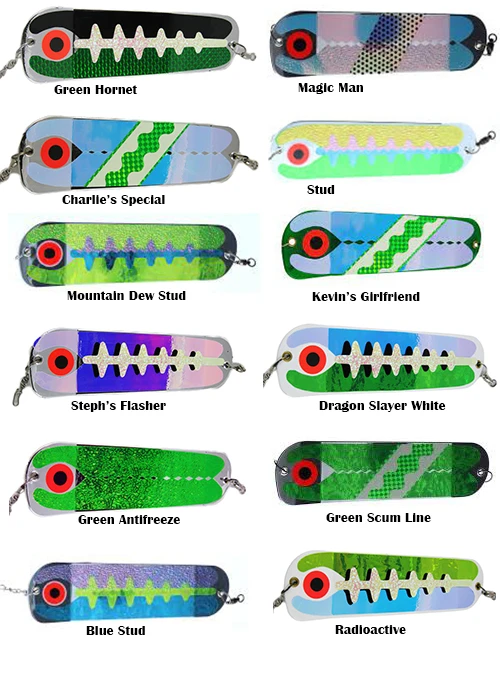 | Color | PFL-1111: Green Hornet, PFL-1107: Charlie's Special, PFL-1116: Mountain Dew Stud, PFl-1103: Steph's Flasher, PFl-1108: Green Antifreeze, PFL-1115: Blue Stud, PFL-1106: Magic Man, PFL-1114: Stud, PFL-1112: Kevin's Girlfriend, PFL-1109: Dragon Slayer White, PFL-1105: Green Scum Line, PFL-1110: Radioactive |